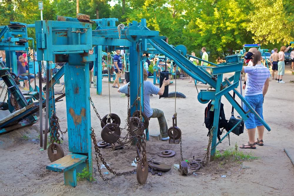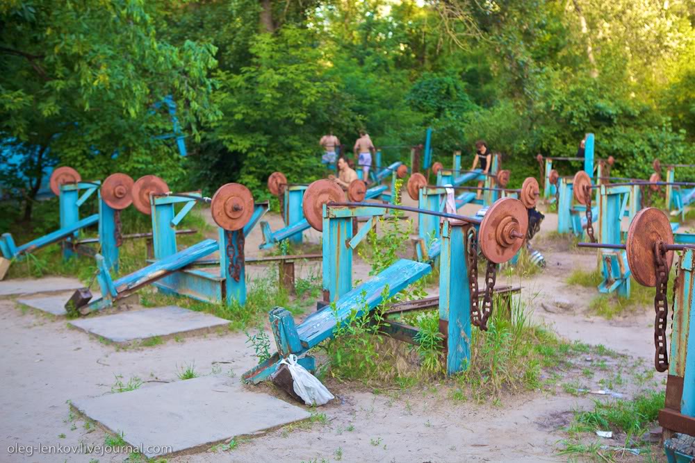 Una auténtica maravilla de gimnasio o parque de fitness con unas máquinas autoconstruidas que parece sacadas de un cómic steampunk.