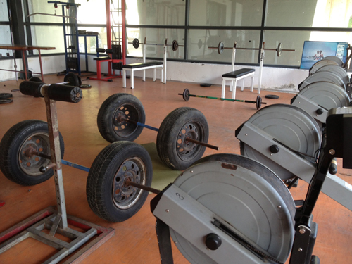Por último, no me resisto a colgar una foto del gimnasio de nuestro club de remo y de las pesas que manejamos. Cuando la gente ajena al club las ve la primera opinión no es demasiado buena, pero luego, cuando explico que es una gran solución para no dañar el suelo al dejar caer la pesa ya que la rueda amortigua el golpe, la opinión cambia… o al menos eso dicen.
