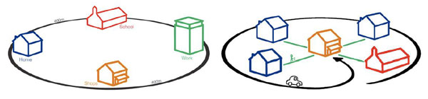 A la hora de planificar la ocupación del suelo, es necesario tener en cuenta que ubicar destinos de actividad cotidiana relativamente cercanos a (o dentro de) los barrios, fomentará los desplazamientos activos. Adecuar las distancias entre los destinos habituales permite asimilar las diferentes actividades como parte de un solo viaje y desplazarse a pie entre ellas: hacer la compra después del trabajo, ir a recoger a las niñas y niños después de realizar gestiones, etc.