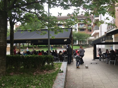 Tras esperar a la salida de las clases, algunos padres y madres se quedan charlando en el bar de la plaza mientras los pequeños juegan. El rol de ‘padre’ o ‘madre’ ofrece un marco común que facilita relaciones y conversaciones entre personas diferentes. El hecho de pertenecer a distintos grupos sociales, con mayor o menor capacidad económica o de diferentes países de origen, no parece ser relevante a la hora de establecer conversaciones «de madres-padres» de la ikastola y otras personas adultas que se encuentran allí.