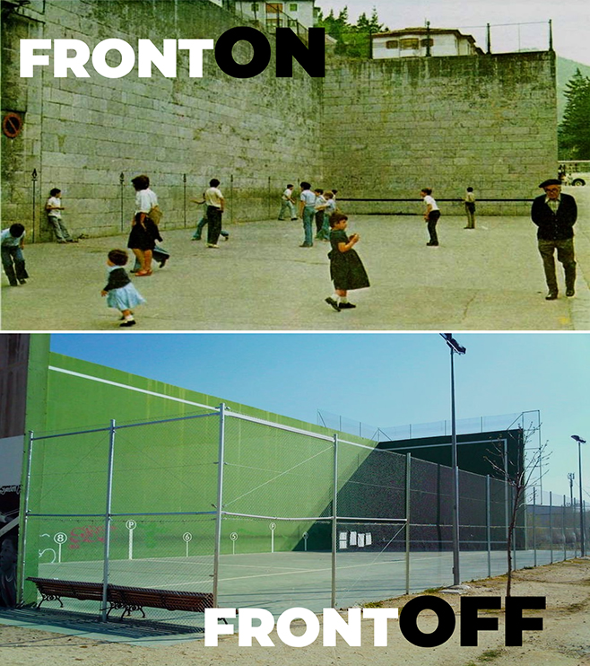 Reconocimiento: Es obligado reconocer a Juan Aldaz la autoría del juego de palabras FrontON-FrontOFF. En una comida en la cafetería de la universidad estuvimos hablando sobre el efecto de los modelos de gestión de los espacios deportivos abiertos y el cambio profundo en el simbolismo del frontón en nuestros pueblos.Con esta idea, Juan hizo una genial conferencia de cierre de los X Encuentros de Políticas Deportivas en los Municipios 2015 (IRUN-GIPUZKOA) y la articuló a partir de este juego de palabras. Desde entonces vamos desvariando.
