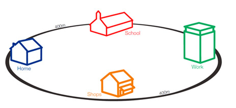 El planeamiento urbanístico debe apostar por una ocupación y uso del suelo eficiente combinando los usos compatibles, principalmente a escala de barrio. Desde la perspectiva de una ciudad activa, adecuar las distancias entre los destinos habituales permite asimilar las diferentes actividades como parte de un solo viaje y desplazarse a pie entre ellas: hacer la compra después del trabajo, ir a recoger a las niñas y niños después de realizar gestiones, etc.