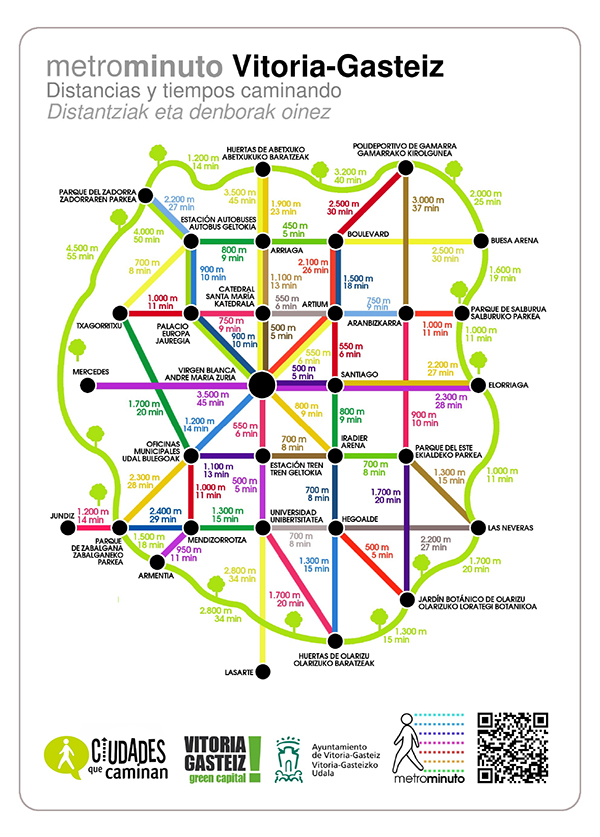El metrominuto es un mapa o plano sinóptico que mide distancias entre varios puntos y los tiempos medios que se tarda en desplazarse por ellos. Es, en definitiva, una representación gráfica de su red peatonal y una herramienta para favorecer la movilidad peatonal. En la web de la Red de Ciudades que Caminan se presentan los casos de las ciudades pertenecientes a la red.