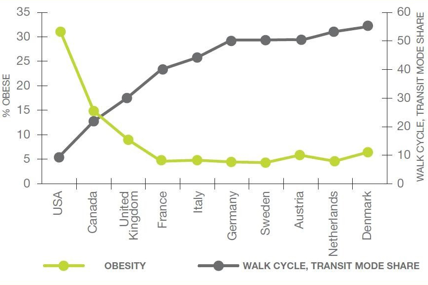El uso del transporte público a su vez, implica caminar hasta las paradas-estaciones y entre estas y el destino final. Un indicador muy ilustrativo es la relación existente entre el porcentaje de desplazamientos activos o mediante transporte público y el porcentaje de obesidad de la población.
