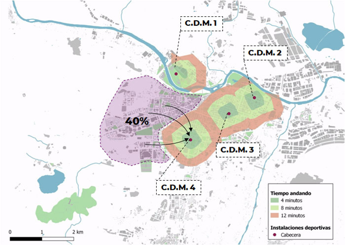 El desequilibrio en el acceso a los centros deportivos municipales generaba, además, problemas de gestión ya que uno de los centros concentraba una demanda deportiva mucho mayor de lo que podía absorber, originándose importantes listas de espera. Situaciones como esta también provocan problemas de transporte urbano, ya que requieren un mayor número de desplazamientos motorizados, con el consiguiente impacto ambiental y coste para la población. Al aplicar un modelo de localización-asignación que optimizaba la eficiencia económica espacial se planteó una ubicación para el nuevo centro deportivo municipal que daba respuesta a dos terceras partes de ese 40% que vivía a más de 12’ de los otros centros.