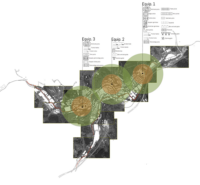En el siguiente mapa puede observarse los distintos espacios que componen los tres grandes equipamientos deportivos de otra ciudad. En él se observa cómo uno de los equipamientos, el más grande y alejado del centro, cuenta con el mayor número de salas en las que se ofrecen servicios de deporte para todas las personas. Los dos equipamientos ubicados en el centro de la ciudad, en cambio, cuentan principalmente con canchas y campos, acogiendo mayoritariamente actividades de equipo. Esta distribución obligaba a un mayor desplazamiento a la mayoría de la población, mientras que los equipamientos más céntricos estaban infrautilizados la mayor parte del día. La propuesta era clara: las inversiones en equipamientos debían corregir esa distribución de servicios.